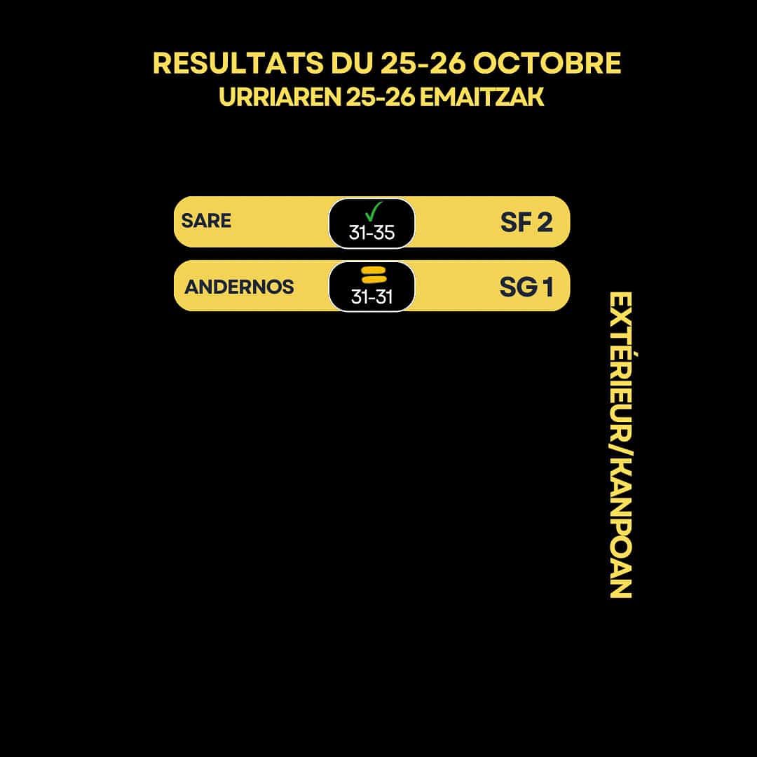 Réaction : “Enfin réguliers ! Nous repartons d’Andernos avec des points obtenus de belle manière. Si le scénario nous à été favorable en fin de match, l’ensemble de la partie a été équilibré. Deux belles équipes qui se sont rendues coup pour coup. De quoi finir sur une note positive, avant la semaine de repos accordée aux joueurs. Le mois de novembre s’annonce décisif pour confirmer et s’installer dans le haut du classement. Prochaine étape le 8 novembre face à Aurillac à Airoski“ – Thomas Beyne, entraîneur de Irisartarrak