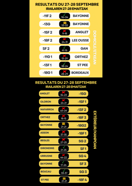 Aphecetche, Elosegi-Martinon, Etchebehere 7 dont 1 p, Franchisteguy (cpt) 4, Ladeuix 3, Lamothe, Muscarditz 7, Neyrac 2, Vega-Petit 2