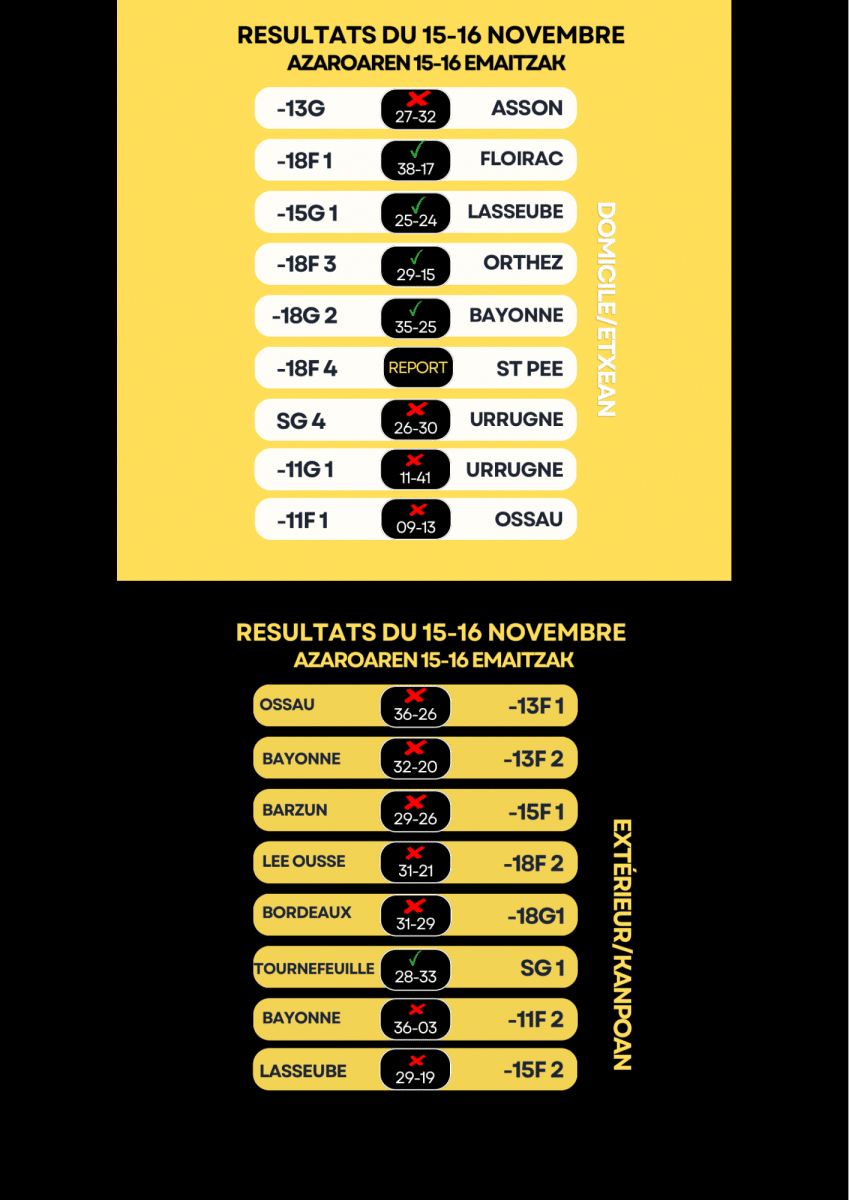 RÉSULTATS DU 15-16 NOVEMBRE / AZAROAREN 15-16 EMAITZAK